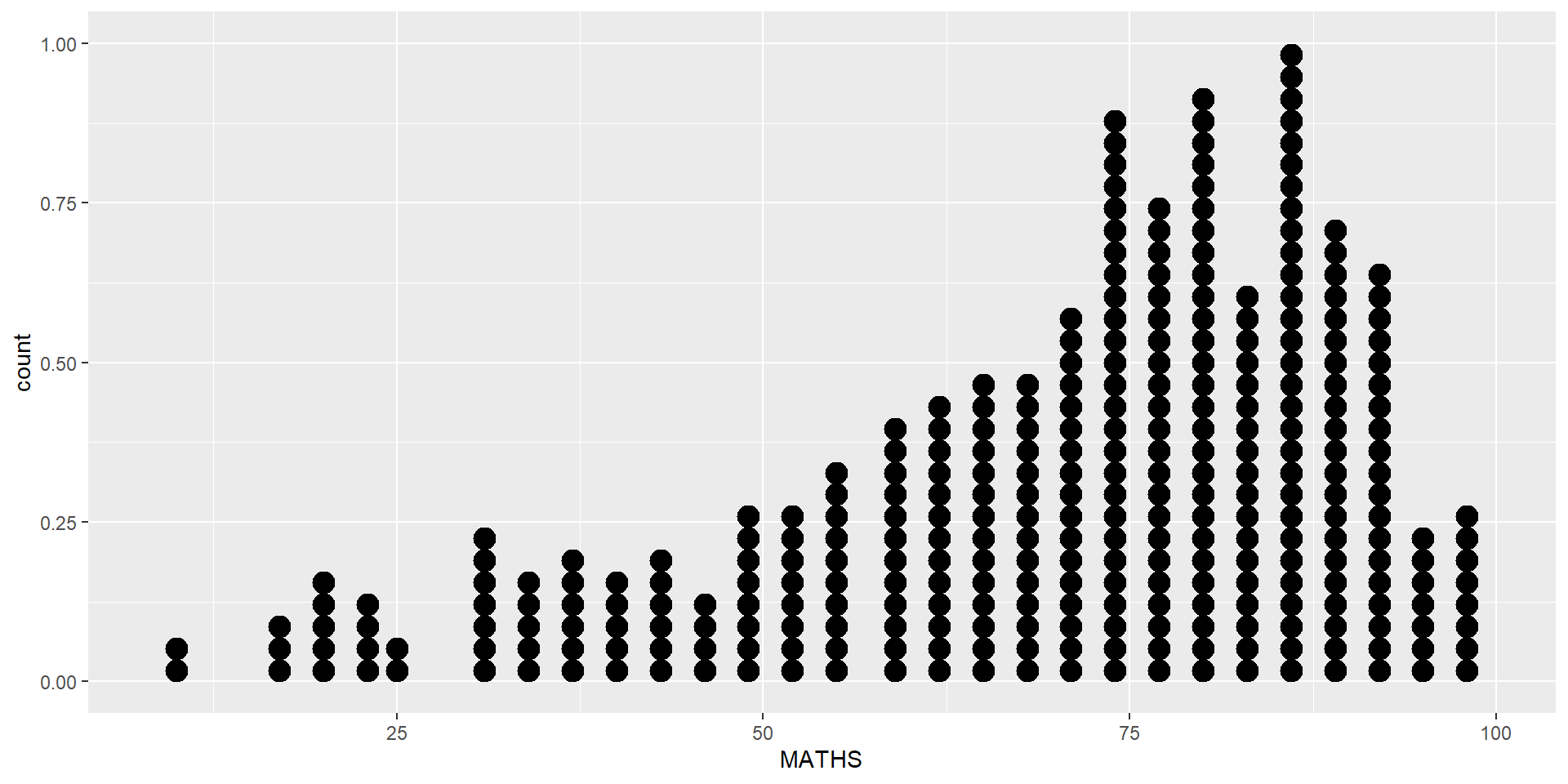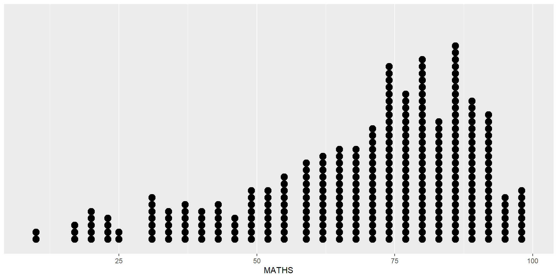 In the code chunk below, geom_dotplot() of ggplot2 is used to plot a dot plot.