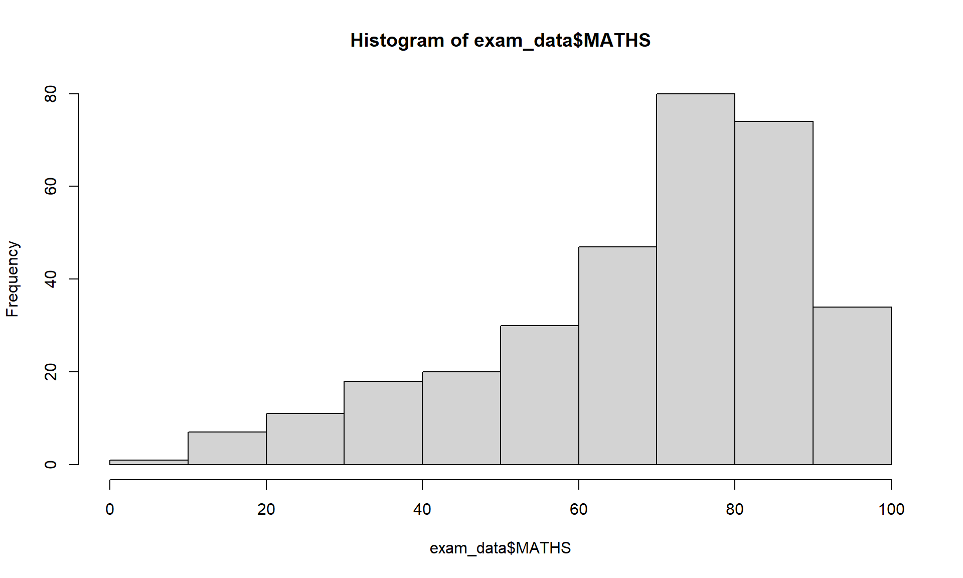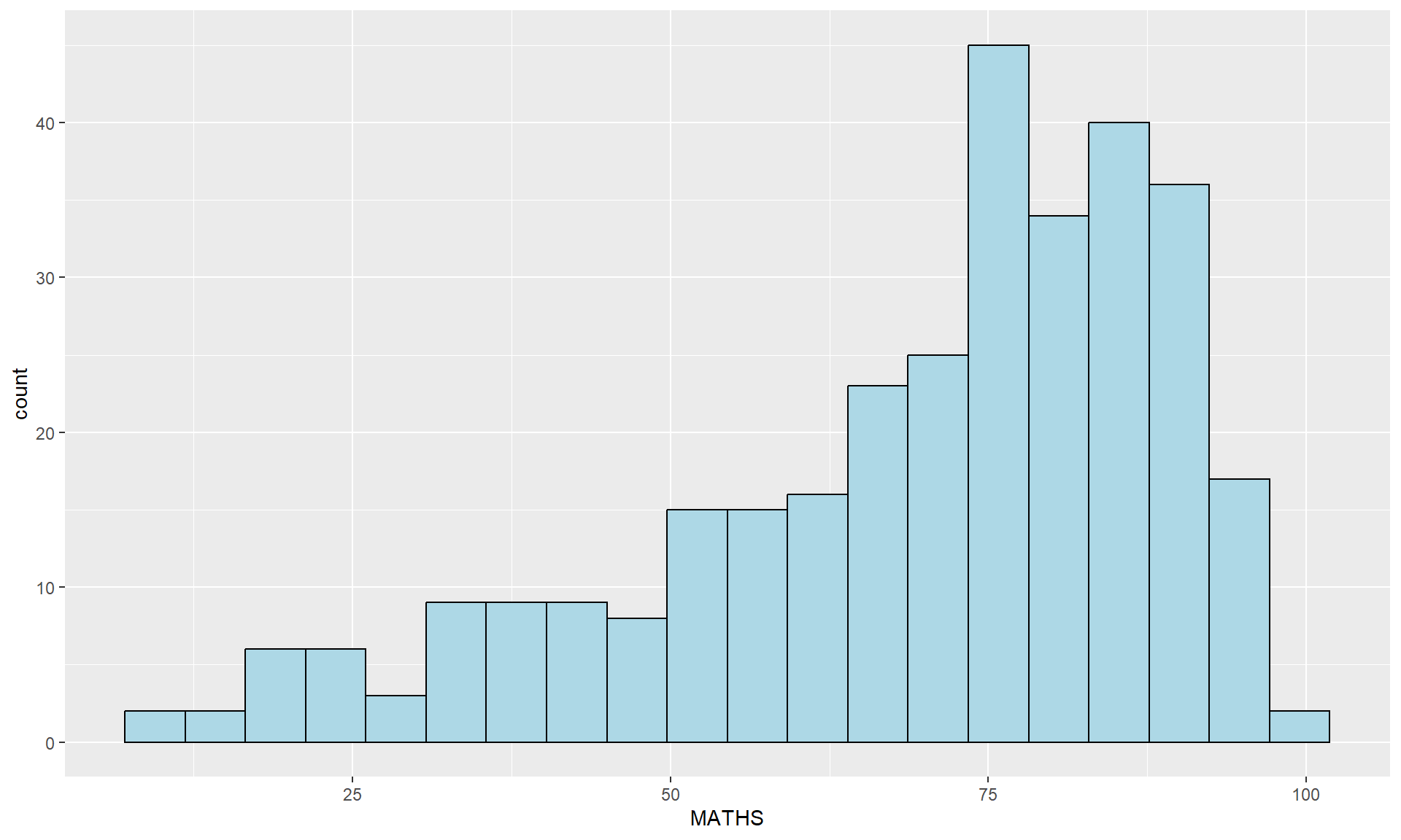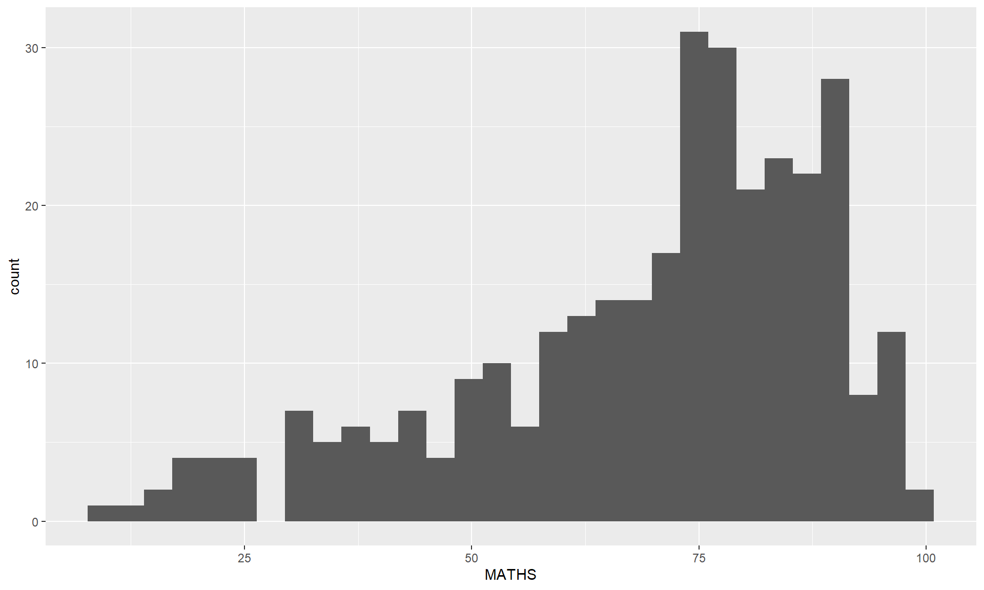geom_histogram()In the code chunk below, geom_histogram() is used to create a simple histogram by using values in MATHS field of exam_data.