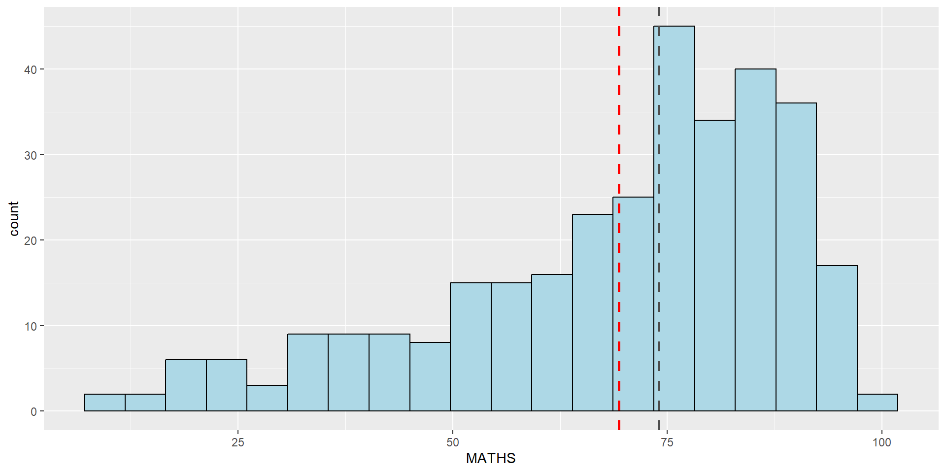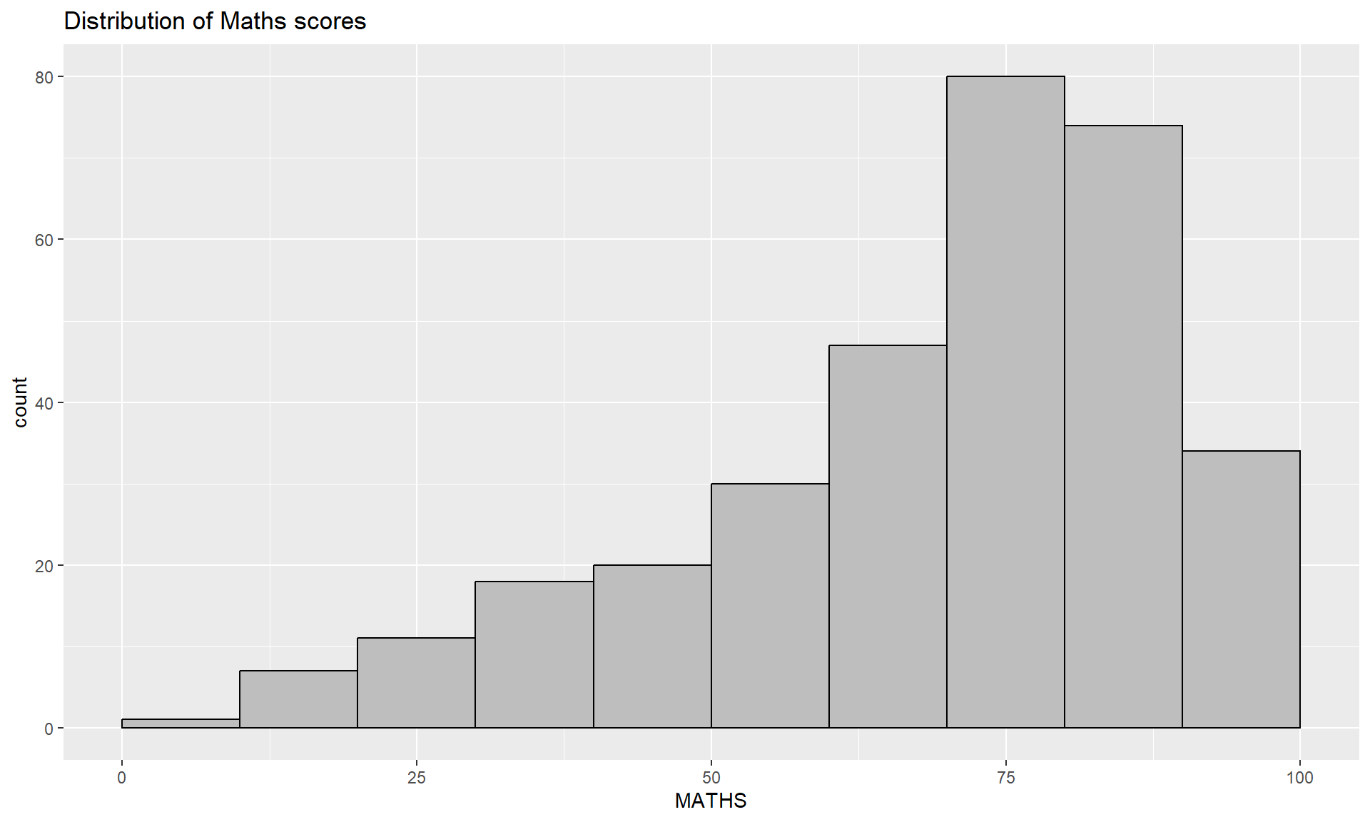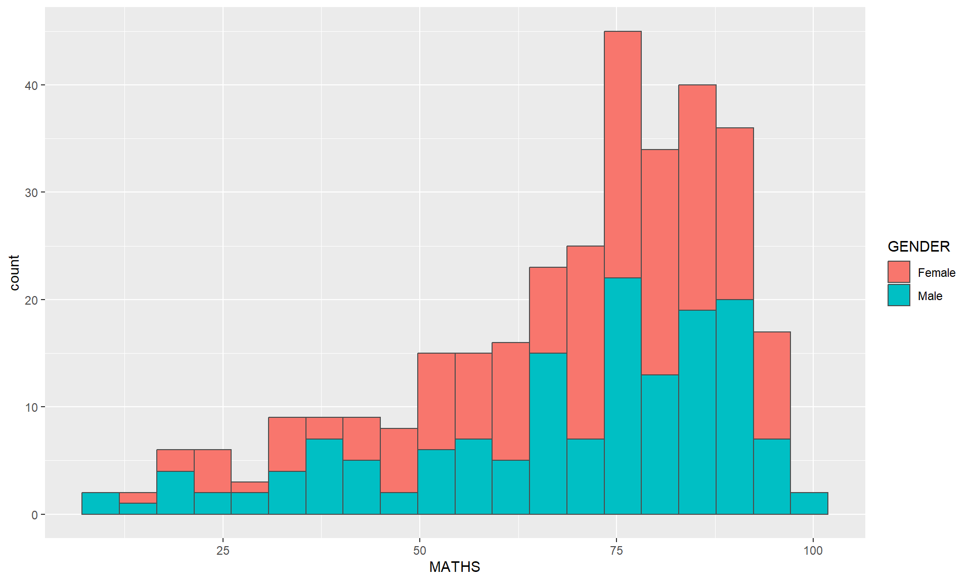 geom_histogram()In the code chunk below, geom_histogram() is used to create a simple histogram by using values in MATHS field of exam_data.