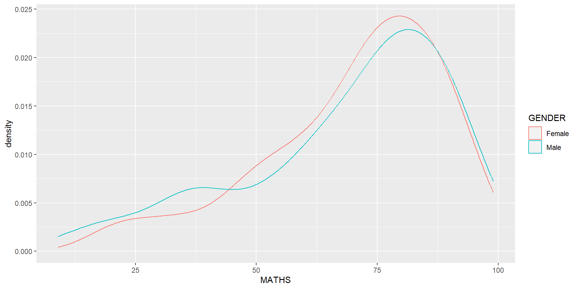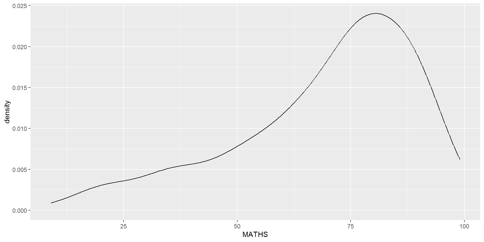 The code below plots the distribution of Maths scores in a kernel density estimate plot.