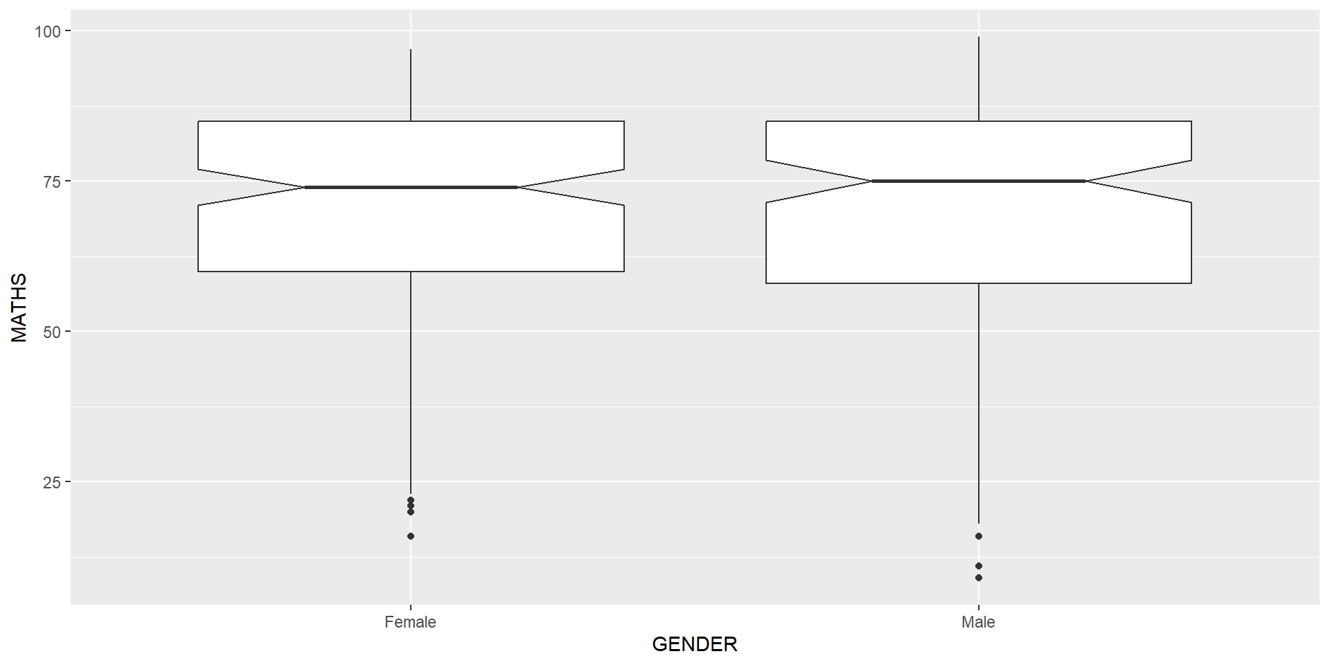 The code chunk below plots the distribution of Maths scores by gender in notched plot instead of boxplot.