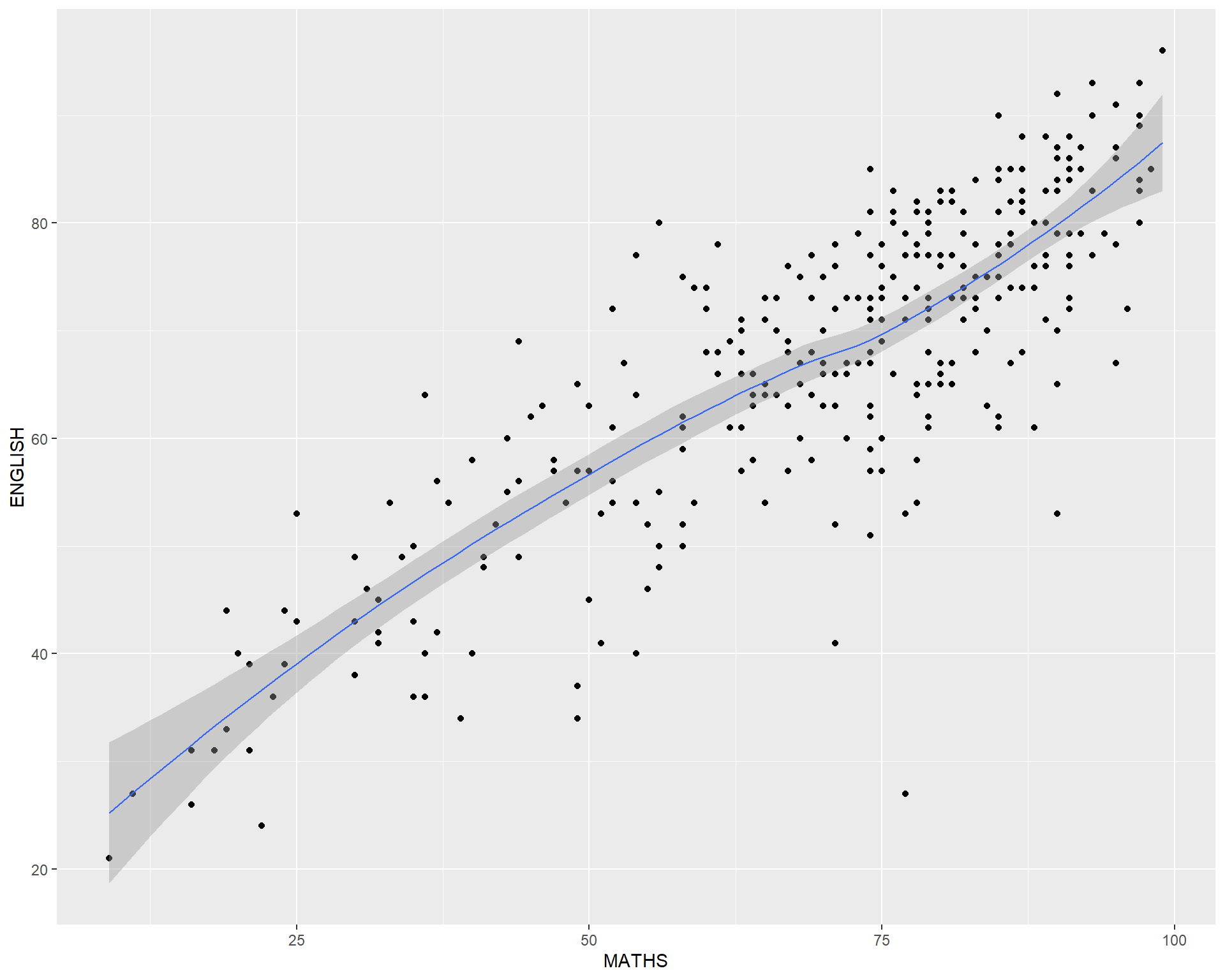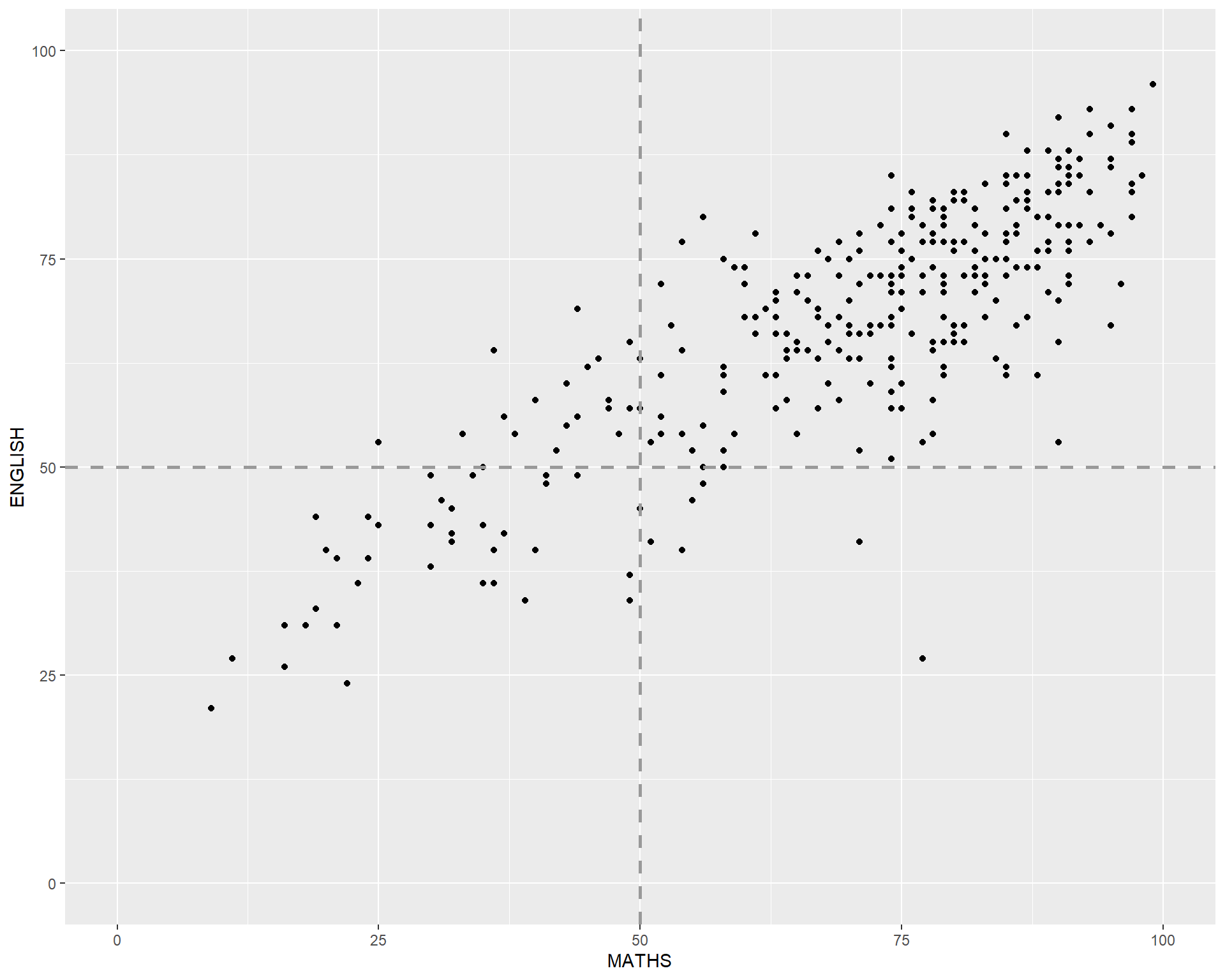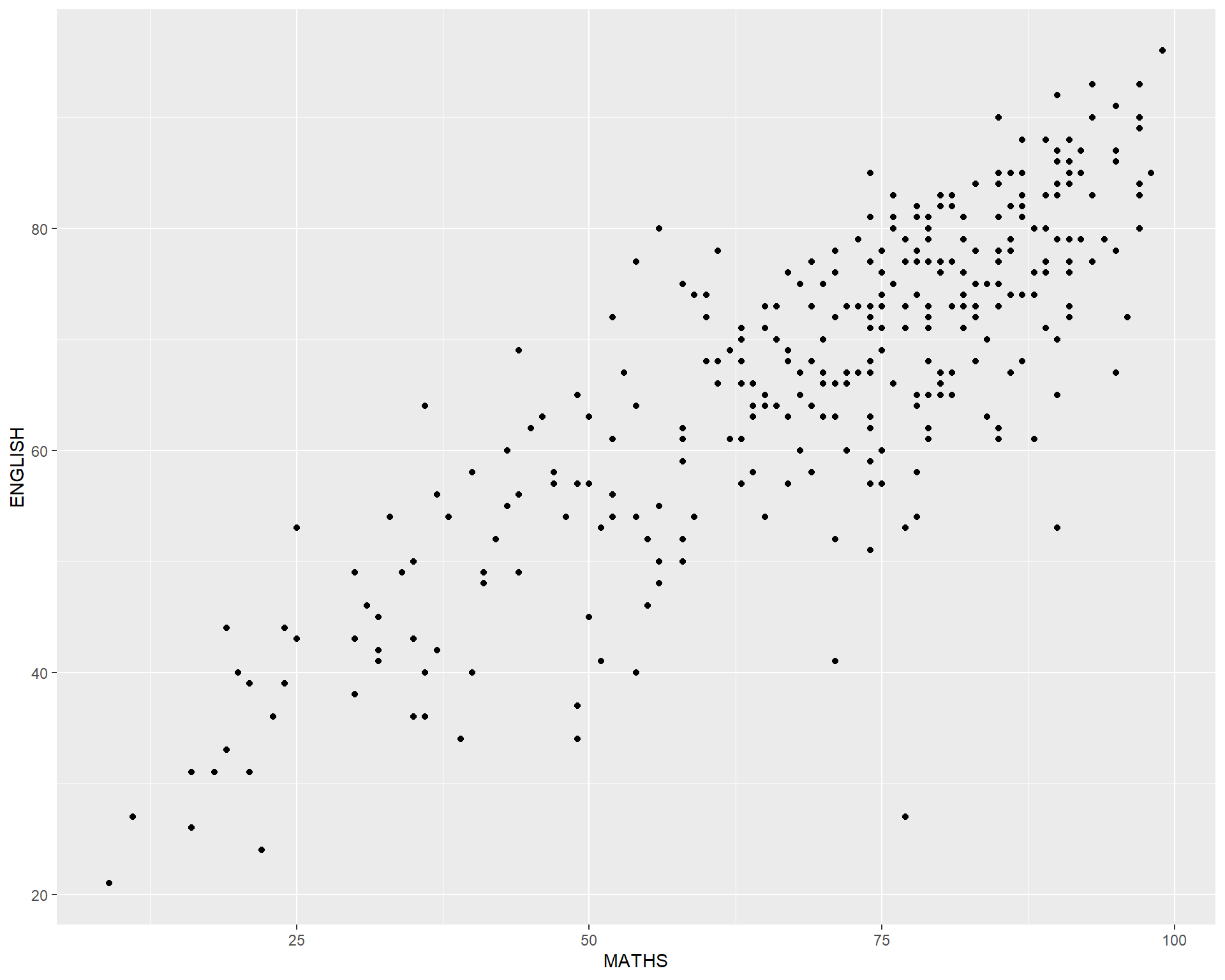 geom() methodThe scatterplot on the right shows the relationship of Maths and English grades of pupils.