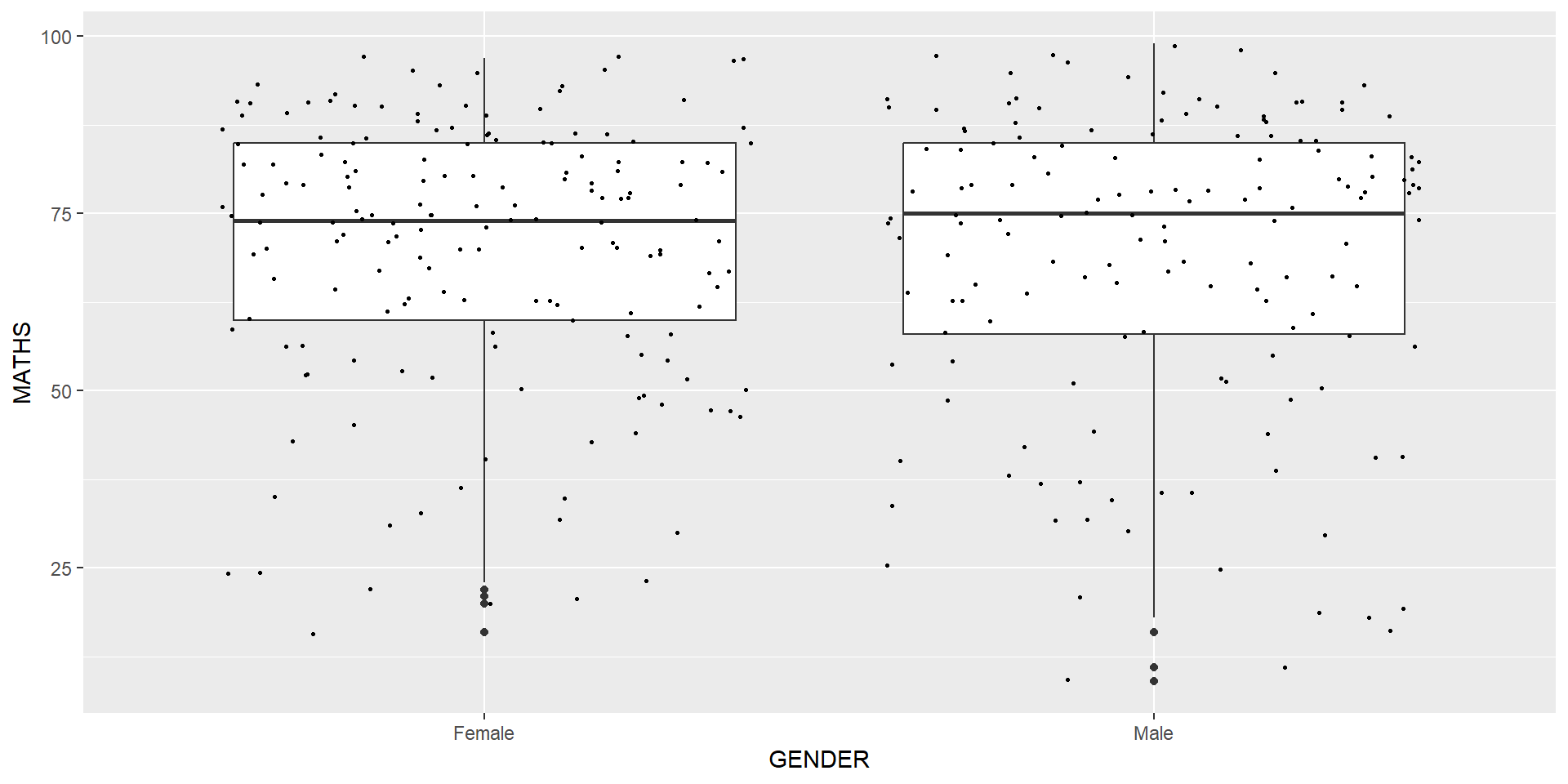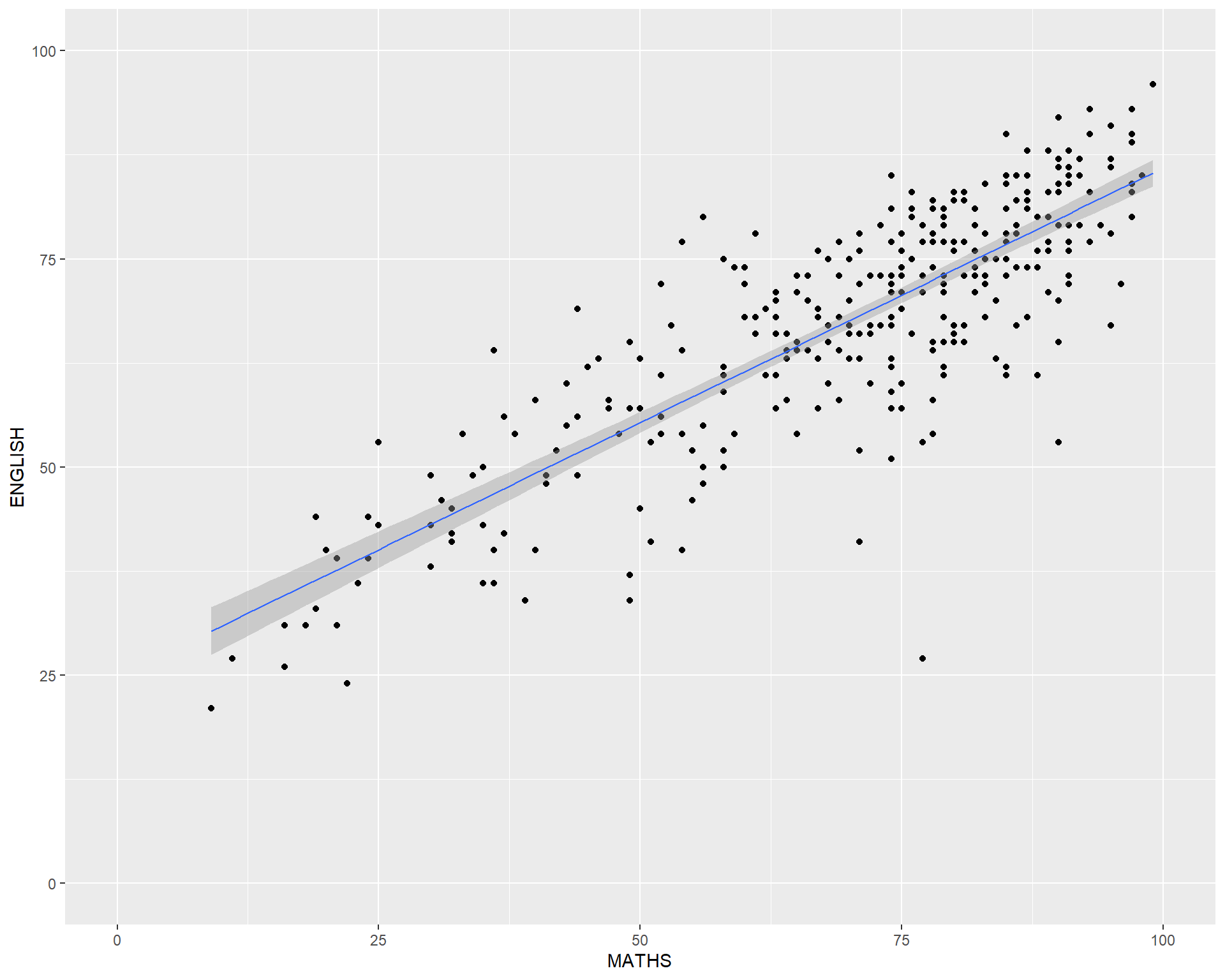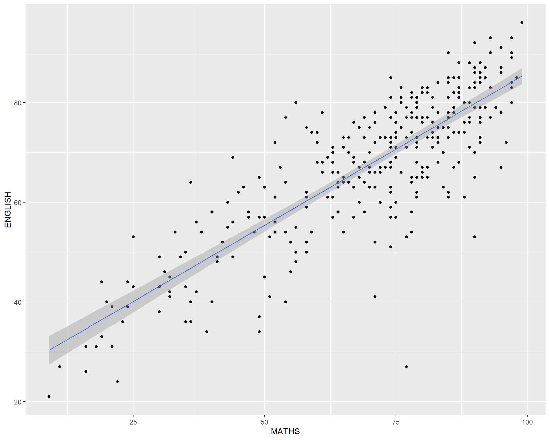 geom() methodThe scatterplot on the right shows the relationship of Maths and English grades of pupils.