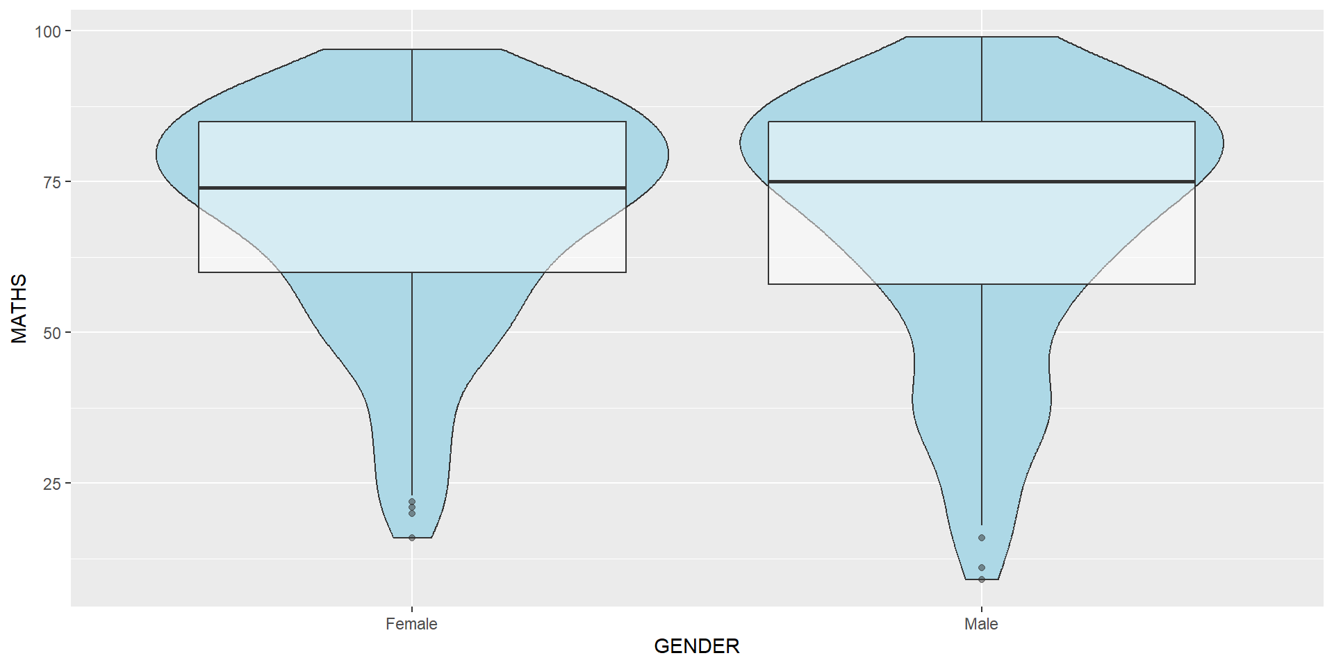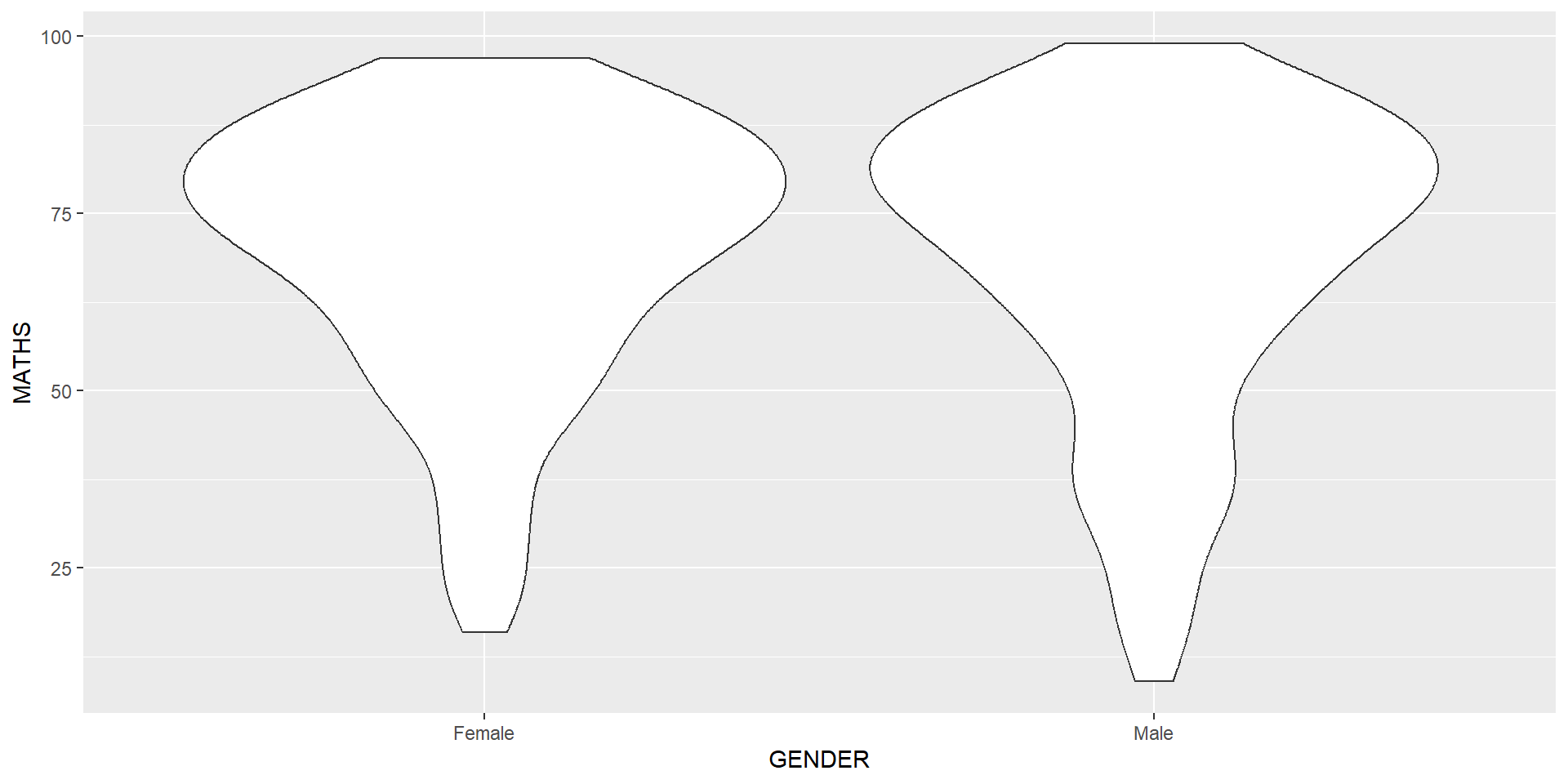 The code below plot the distribution of Maths score by gender in violin plot.
