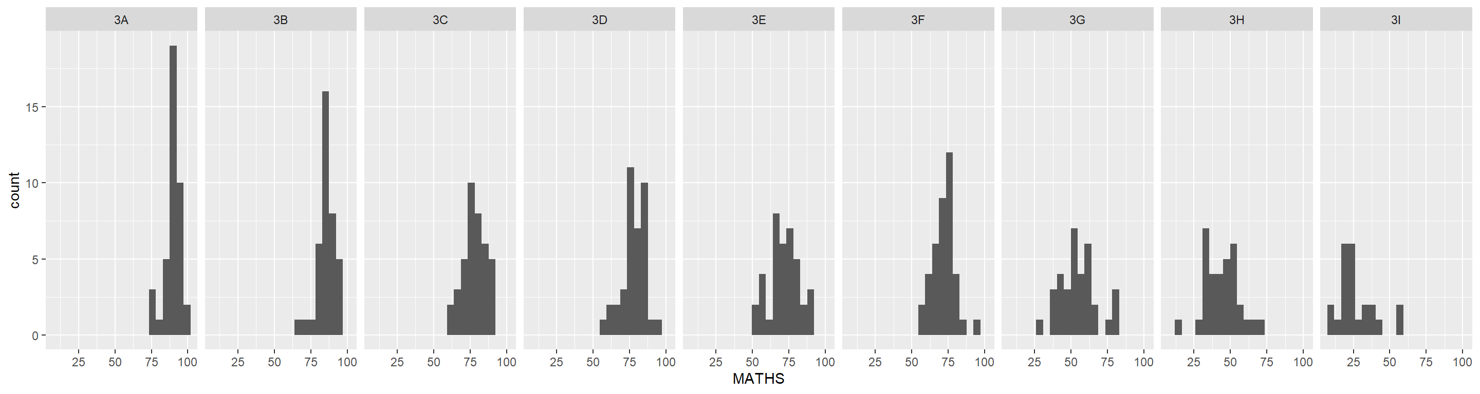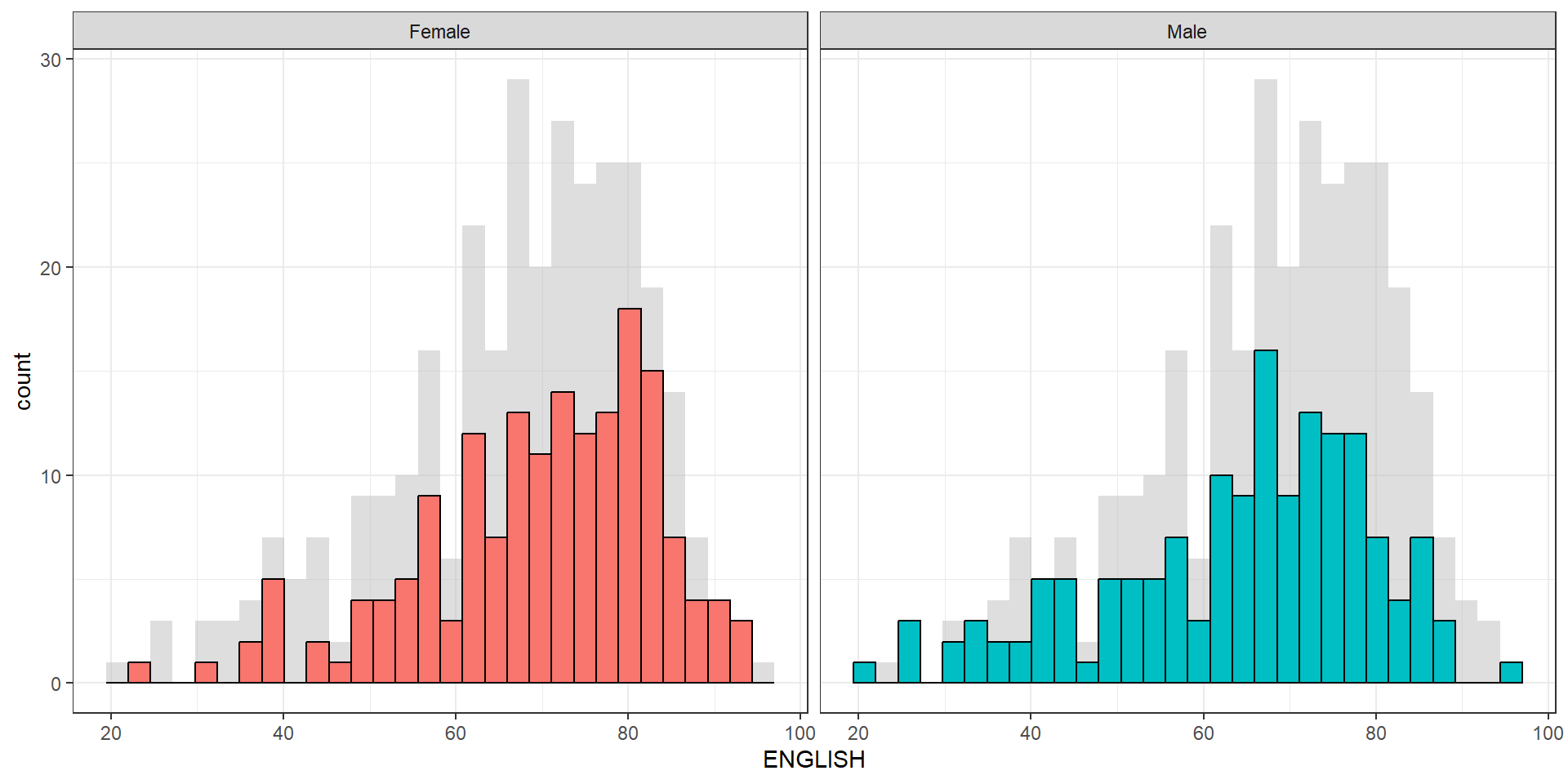 Create a makeover looks similar to the figure below. The background histograms show the distribution of English scores for all pupils.