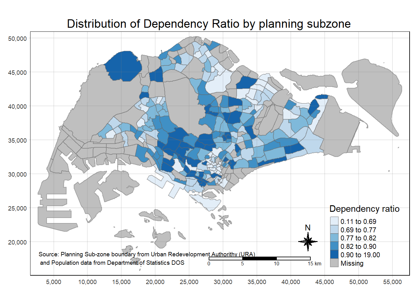tm_layout(main.title = "Distribution of Dependency Ratio \nby planning subzone",