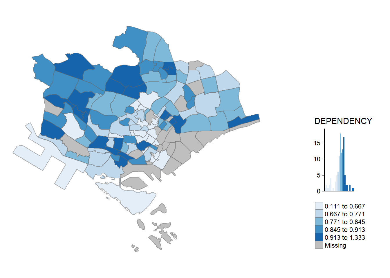 Before we get started, it is always a good practice to get some descriptive statistics on the variable before setting the break points. Code chunk below will be used to compute and display the descriptive statistics of DEPENDENCY field.