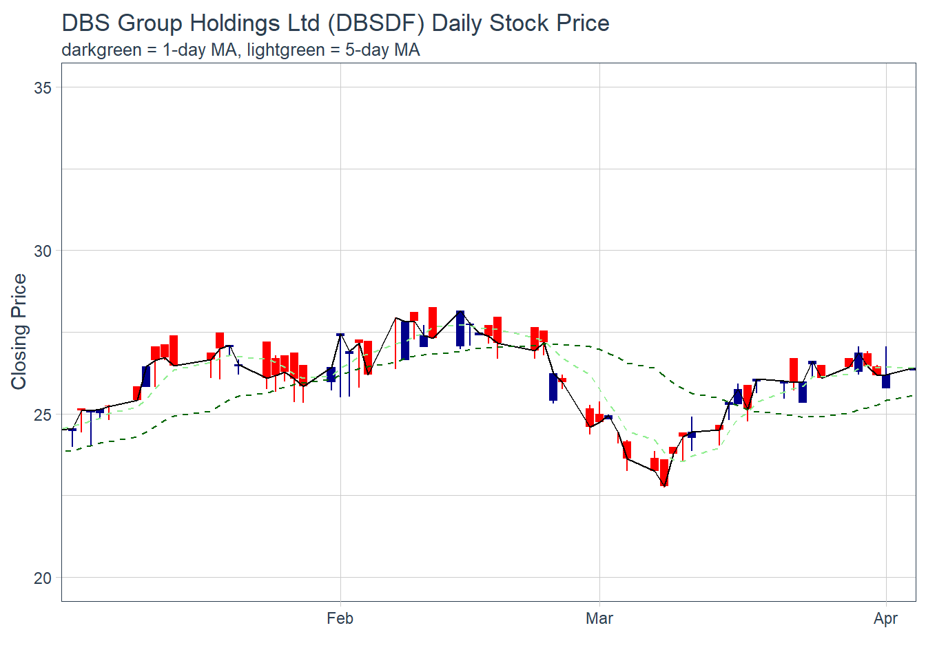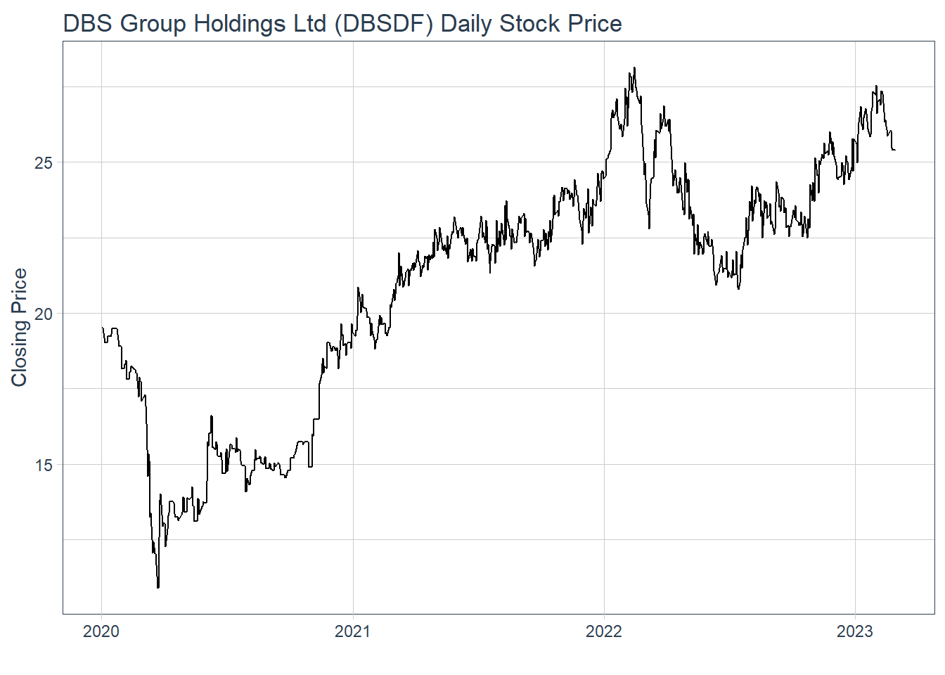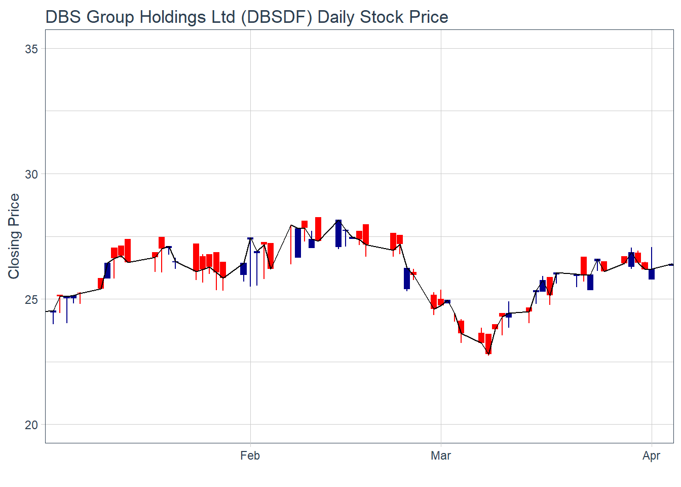 labs(title = "DBS Group Holdings Ltd (DBSDF) Daily Stock Price",