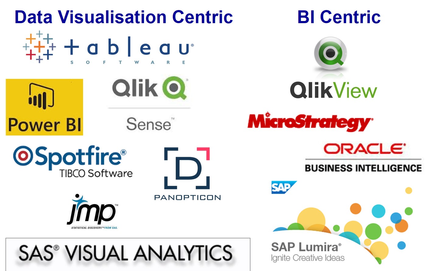 • Visual analytics tookit such as Tableau, JMP, PowerBI, Qlik Sense/View & TIBCO SpotFire.
