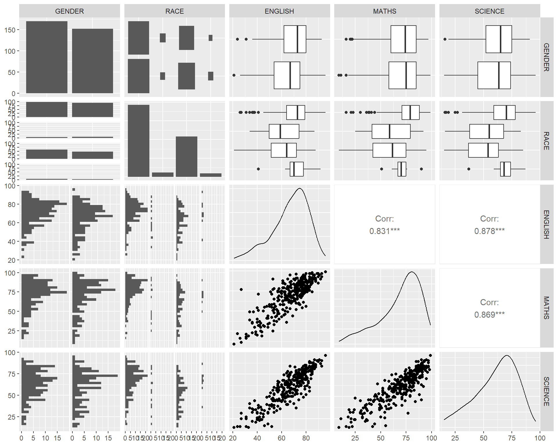• The ggpairs() function build a classic correlogram with scatterplot, correlation coefficient and variable distribution. On top of that, it is possible to inject ggplot2 code, for instance to color categories.