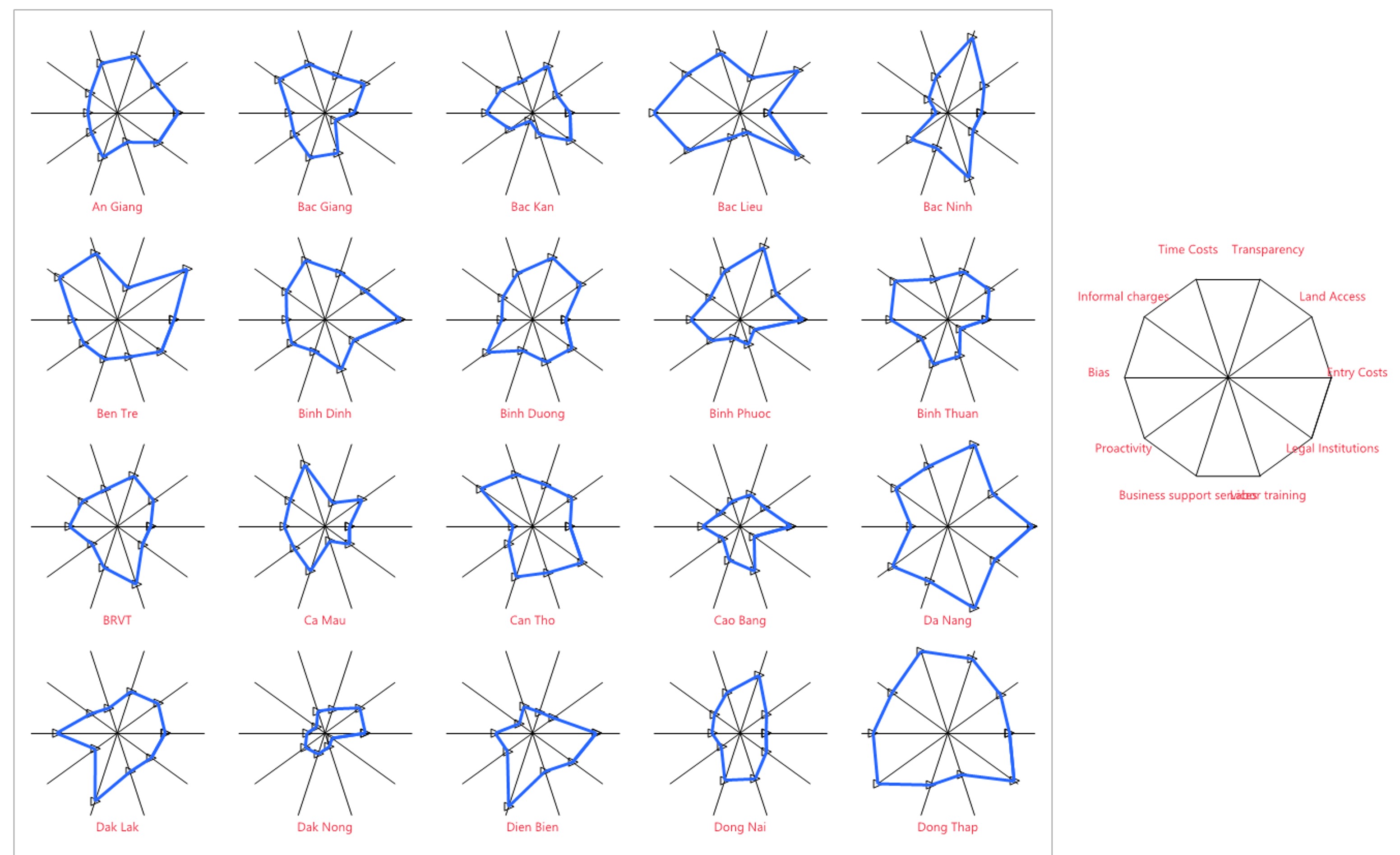 • The star plot consists of a sequence of equi-angular spokes, called radii, with each spoke representing one of the variables. The data length of a spoke is proportional to the magnitude of the variable for the data point relative to the maximum magnitude of the variable across all data points. A line is drawn connecting the data values for each spoke. This gives the plot a star-like appearance and the origin of the name of this plot.