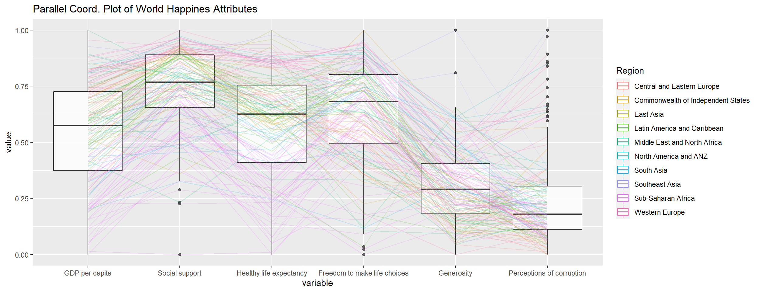 • ggparcoord() is a function of GGally package for plotting static parallel coordinate plots, utilizing the ggplot2 graphics package.