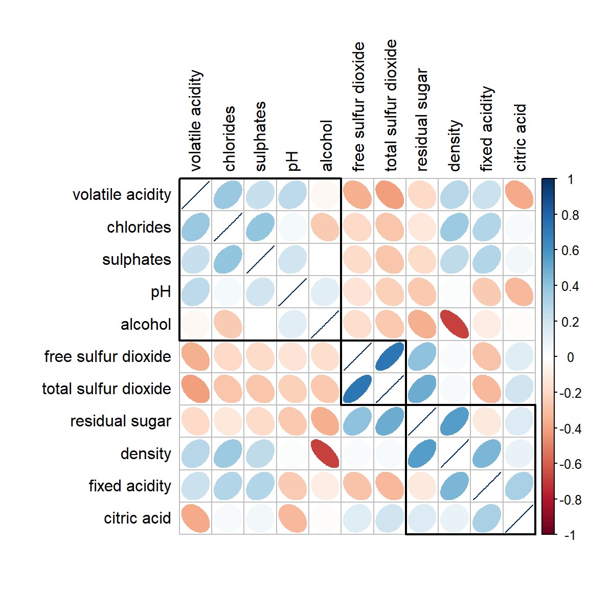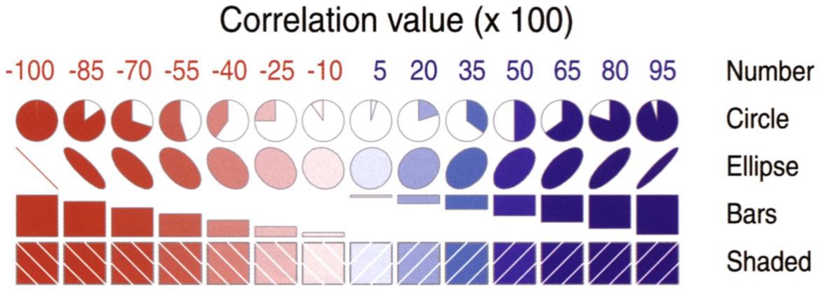 • Correlogram uses visual geometrics such as ellipse, circle, square, and bars to replace the scatterplot in correlation matrix.