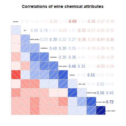 • The corrgram is one of the oldest R package specially designed to correlograms. You can choose what to display in the upper, lower and diagonal part of the figure: scatterplot, pie chart, text, ellipse and more.