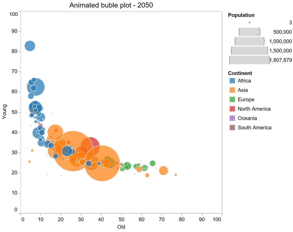 A motion chart displays changes over time by showing movement within the two-dimensional space and changes in the size and color of the bubbles.